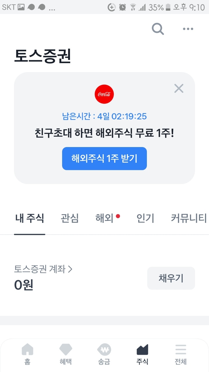 5) 토스 증권 해외주식 1주 이벤트: 아 떨려....코카콜라 주시옵소서 저 파란 해외주식 1주 받기 클릭해주세요